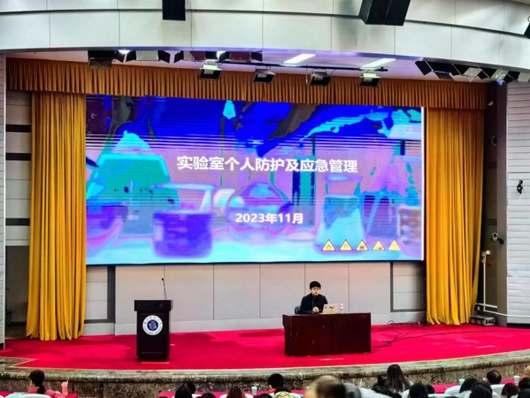 本网讯 为增强师生安全意识,提高应急处置能力,11月30日晚,学校在教育大楼报告厅开展以“实验室安全个人防护及应急管理”为主题的安全培训讲座,各学院分管实验室安全工作负责人,实验室安全管理人员、技术人员、实验教学一线教师、学生代表共300余人参加活动。讲座由国有资产与实验室管理处副处长陈晨主持。