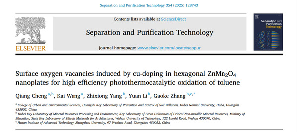 本网讯 近日,我校城市与环境学院碳中和能源转化研究团队程强博士在Separation and Purification Technology上发表题目为“Surface oxygen vacancies induced by cu-doping in hexagonal ZnMn2O4 nanoplates for high efficiency photothermocatalytic oxidation of toluene”的研究型论文。《Separation and Purification Technology》为中科院一区TOP期刊,影响因子8.1,注重报道化学和环境工程领域中混合物分离、提纯和碳捕获过程。