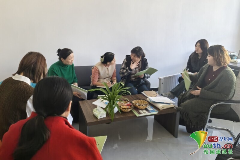 图为学校课程中心的负责教师与实习队员们一起商讨社团课程的开设。