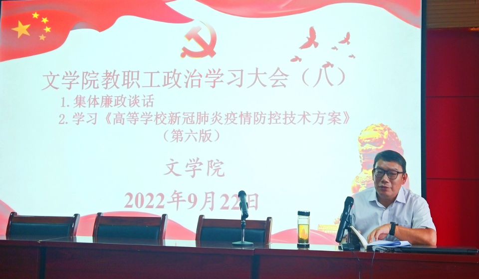 2022年9月22日下午,文学院党委在学院602会议室召开教职工集中政治学习大会,会议由党委书记严志谷主持,全体教职工参加会议。
