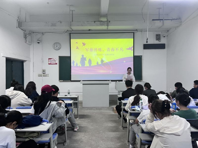 为鼓励广大青年大学生携笔从戎、担当强军兴国的大任,提升大学生国防意识,激发大学生参军入伍的热情,2023年10月26日晚,文学院学生自律委员会退役学生服务部于人文楼21AT06教室开展“军旅淬炼,青春不凡”宣讲活动。文学院辅导员吴鸿杰老师、4位退役学生代表以及80余名学生参与本次活动。活动由退役学生服务部干事代敏同学主持。