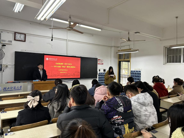 黄雅帆、杨颖、罗心宇作为学生代表发言。黄雅帆说:“作为研究生,我将认真学习专业知识,深刻领会两会精神并将其落实到日常学习工作中,把握时代新脉搏,聚焦时代新热点,以新姿态、新思维、新视点洞察科研前线,将人文之精神融入科技强国之战略,秉持“诚毅勤敏”的湖师精神,书写属于当代新青年的满意答卷。”杨颖说到身处大学校园,有更加丰富的学习资源和锻炼机会,身为研究生更要不断提高自己的思想觉悟,珍惜汲取知识的每一分每一秒。罗心宇号召同学们学习领会两会精神,深学笃行,提到报告从七个方面的主要成绩和六个方面的工作,全面回顾总结了过去一年在全国国民经济和社会发展方面取得的成就。