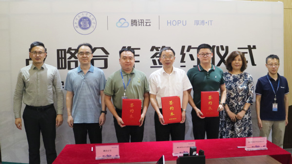 2022年6月23日,我校与腾讯云计算(北京)有限责任公司、武汉厚溥数字科技有限公司在腾讯武汉研发中心举行“产教融合共建腾讯云大数据产业学院”签约仪式。学校董事长李咏成、院长李开灿、常务副院长杨学斌、副院长张志华、副院长王胜国出席签约仪式。
