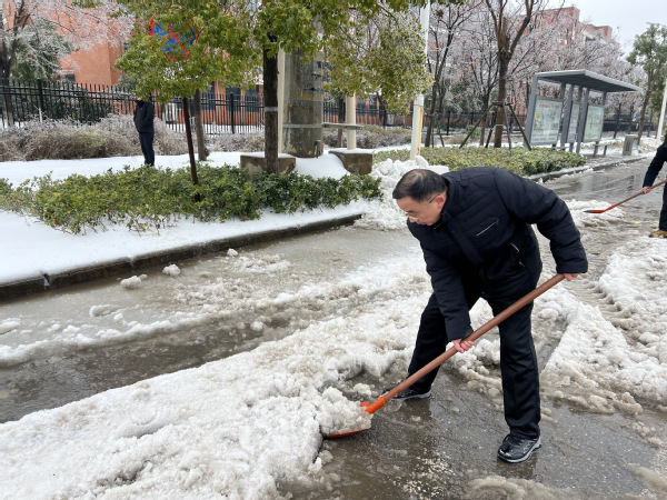 本网讯(通讯员 涂亦乐)2月21日晚,全市迎来了新一轮低温雨雪冰冻天气。为消除雪天冰冻带来的安全隐患,方便群众出行,22日上午,在校校领导李开灿、杨学斌、张志华、王胜国带队,组织党员干部、值班教师和后勤保卫部全体人员在校园和社区主干道开展铲雪除冰行动。