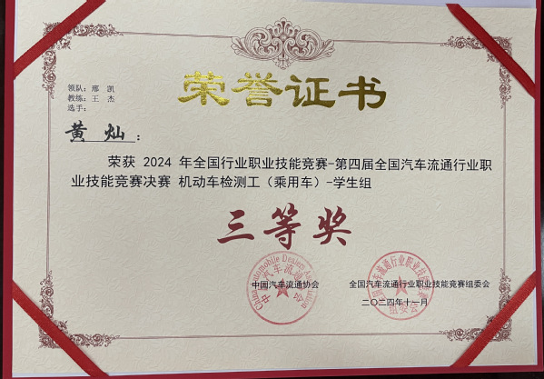 本网讯(通讯员 谭姣)12月1日上午,2024年全国行业职业技能竞赛——第四届全国汽车流通行业职业技能竞赛机动车检测工(乘用车)赛项总决赛在许昌科技学校圆满落幕。我校新能源汽车产业学院新能源汽车技术专业2204班黄灿同学荣获学生组国赛三等奖。