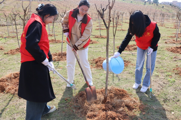 活动开始后,教工党员与学生党员携手并肩,迅速组建起十余个6人协作小组。在专业人员的悉心指导下,大家热情高涨,挥锹铲土、扶苗培土,每一个动作都透露出对绿色生态的深切关怀。整个过程中,专业人员不时提醒着关键细节:“坑的深度要精准控制在30厘米,以确保树苗根系的舒展;回填土需分层踩实,为树苗提供稳固的生长环境;树苗在填土时务必扶正,这是它们茁壮成长的基础。”这些细致入微的指导,让在场的每一位党员都深刻体会到了植树的科学性与艺术性。