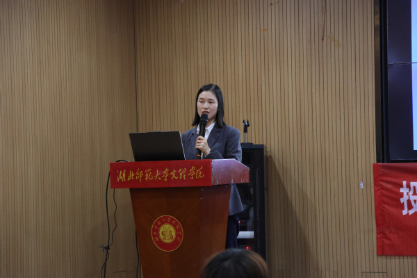本网讯(通讯员 邓忻吾)11月18日晚,经济与管理学院在图书馆报告厅举办“链通金融,智领未来”投资者教育宣讲活动。活动特邀东莞证券武汉营业部投教老师蔡晓,以及理财顾问阮佳欣、李晓丽、任鑫洋组成的专业团队担任主讲。经济与管理学院相关专业教师代表与学生代表参加了讲座。