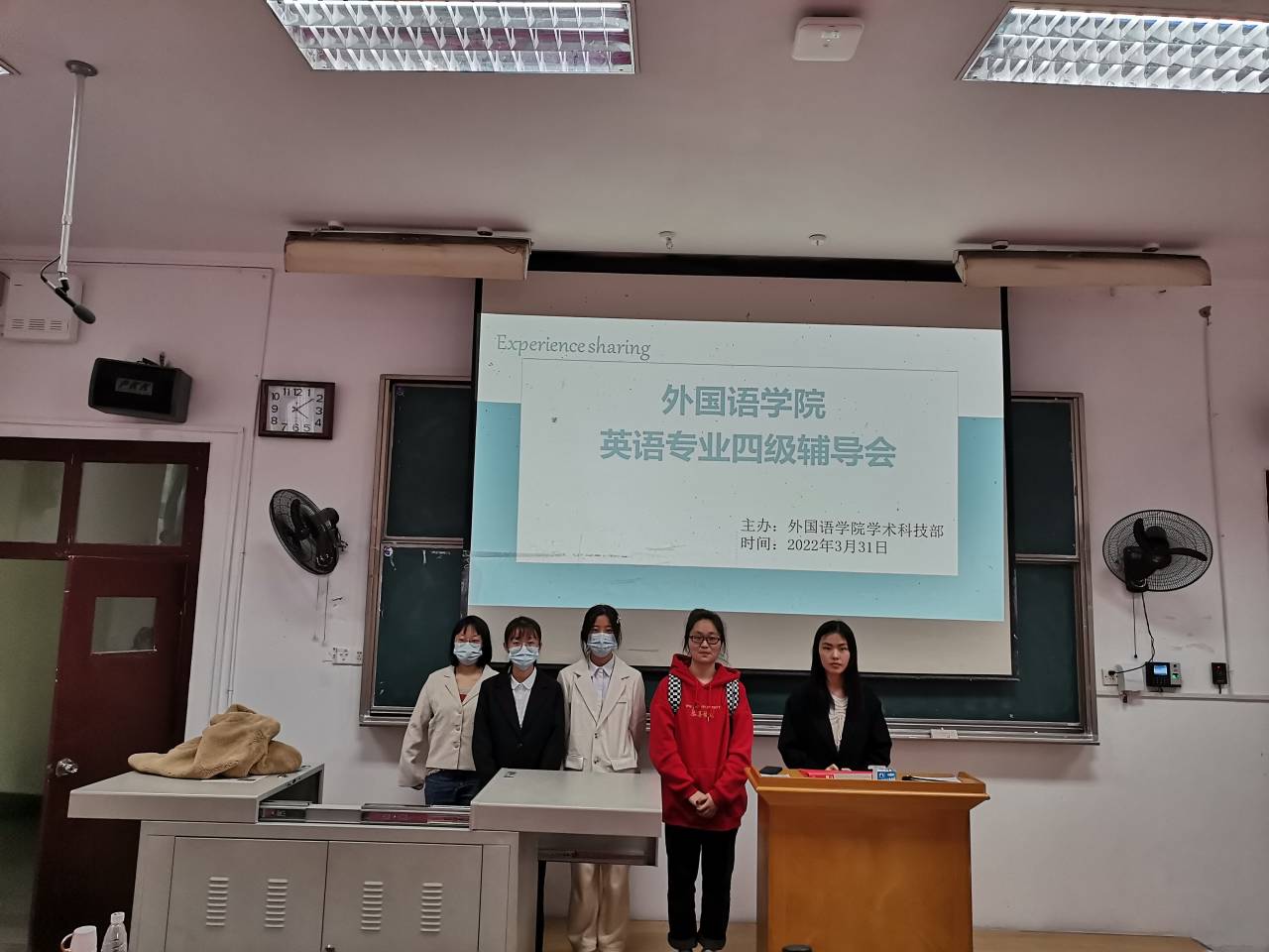 2022年3月31日下午14点20分,外国语学院团总支学术科技部于教育大楼1J22教室举行了2022年英语专业四级考前辅导会,参与此次辅导会的人员为外国语学院20级全体英专生,本次辅导会的主讲人是具有多年英语专业四级指导经验的向群星老师和1902班的2021年度学习标兵田甜。为响应我校疫情防控的相关政策,此次辅导会在抖音平台同步直播。