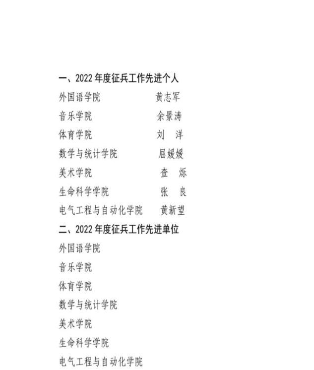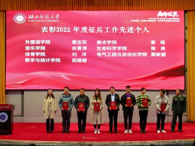 在2022年度征兵工作中,外国语学院荣获湖北师范大学2022年度“征兵工作先进单位”,黄志军老师荣获湖北师范大学2022年度“征兵工作先进个人”。部分文件如下: