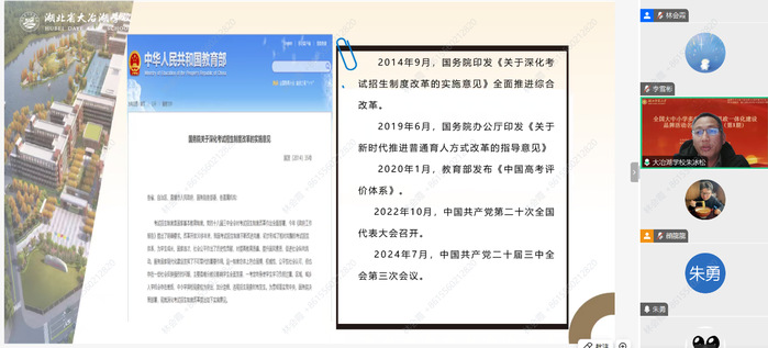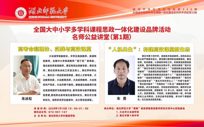 2025年1月16日,湖北师范大学外国语学院联合湖北师范大学“勤敏”省级课程思政教学研究示范中心实践基地大冶市大冶湖学校与黄石市第十四中学,成功举办了2025年第1期全国大中小学多学科课程思政一体化建设品牌活动名师公益讲堂。此次活动由外国语学院院长助理颜龙龙主持,大冶湖学校副校长朱冰松和黄石市第十四中学副校长朱勇进行讲座分享。