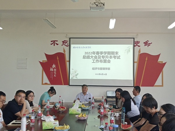 2022年6月16日下午2点半,经济与管理学部于2号实验楼213会议室,召开了学部春季学期期末总结大会及专升本考试工作布置会,本次会议由学部主任商树松主持,学部全体教职员工参加。主要内容如下:1.商树松主任传达学校对2022年专升本考试的工作要求和指示精神,要求各位老师认真遵守考试纪律;2.专业负责人、教研室主任、教学办、行政办、学工办负责人对上半年来的工作进行总结;3.各专任教师相互交流,为学部发展建言献策;4.商树松主任作最后总结。肯定学部2022年上半年以来工作所取得的成绩,同时也指出工作中存在的问题和不足,提出了要求与建议,并对暑假以及下半年的工作进行了安排和部署。