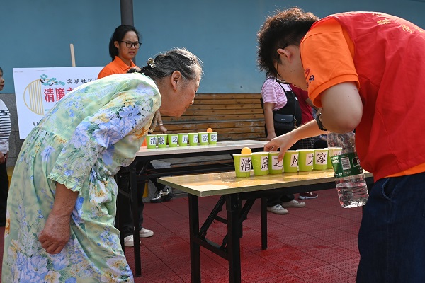 此次活动以“青春伴夕阳”趣味运动会的形式进行,大学生志愿者们带领老人们一起进行了投壶、套圈、吹乒乓球等趣味游戏。充满乐趣的互动活动,让老人们身心愉悦,乐在其中,活动现场处处洋溢着欢声笑语。