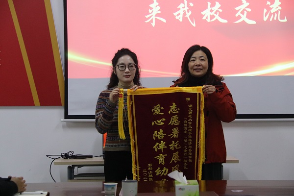 12月10日上午9点,黄石市西塞山区石料山社区党委书记赵慧、党委副书记张晓萍、团委书记龚顺一行来到我校,给经济与管理学部送来了锦旗,感谢我校志愿者在暑期社会实践中的无私奉献和暖心服务。校党委书记杨邓红、校团委书记陈荟芸、经济与管理学部主任徐燕、党总支副书记罗铭等领导老师以及学生代表参加了赠旗仪式。