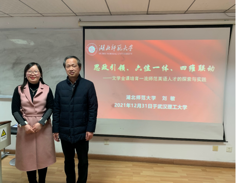 12月31日下午,我校国家级课程思政教学名师刘敏受邀到武汉理工大学学海楼1107会议室进行课程思政建设讲座。会议由武汉理工大学外国语学院英语系黎慧主任主持,外国语学院各系部教师参加,旨在通过狠抓课程建设新基建深入推进本科教学发展。