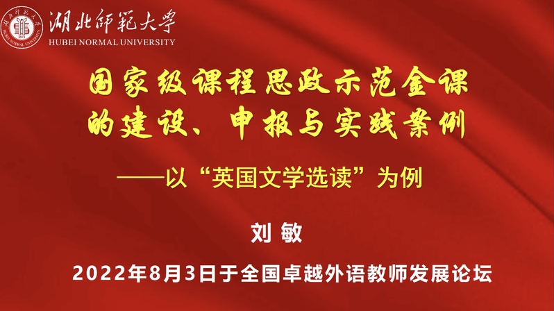 8月3日下午,我校勤敏课程思政刘敏工作室、“英美文学课程群”全国性虚拟教研室主持人刘敏受邀参加全国卓越外语教师发展论坛。围绕“外语课程思政”主题,刘敏作了题为《国家级课程思政示范金课的建设、申报与实践案例——以“英国文学选读”为例》的主旨报告,主要从课程育人和课程思政建设的重要性和国家政策解读、课程思政建设实践探索与典型案例及今后持续建设计划等三方面进行详细阐述,用“出活、出品、出圈、出人才”分享了湖师特色课程思政育人经验。全国5850余名外语教师参与现场直播讲座学习,反响热烈,深受好评。研讨会主持嘉宾、教育部外国语言文学类专业教学指导委员会英语专业教学指导分委员会委员、河北师范大学二级教授、博士生导师李正栓教授点评,认为刘敏课程团队十二年磨一剑凝练的“思政引领、六位一体、四维联动”课程育人模式鲜明,教学研究扎实深入,对教书育人永葆热爱,乐于奉献有激情,且与时俱进,在省内外充分发挥示范引领作用,为高校外语教师课程思政教学实践提供了借鉴和启发。