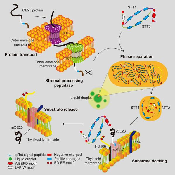 2020年3月12日,张立新教授(野生植物保育与利用湖北省重点实验室学术委员会主任)研究团队在Cell 发表了题为Liquid-Liquid Phase Transition Drives Intra-chloroplast Cargo Sorting的研究论文,首次提出并阐明了相分离驱动叶绿体内蛋白分选的新机制。该研究发现了位于叶绿体基质的关键蛋白转运分选因子STT1与STT2,阐明了双精氨酸依赖转运途径的底物识别、分选以及转运靶定到双精氨酸依赖转运途径的分子机制。