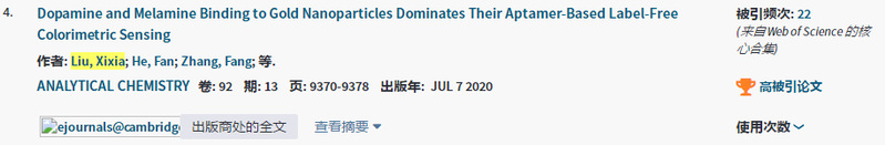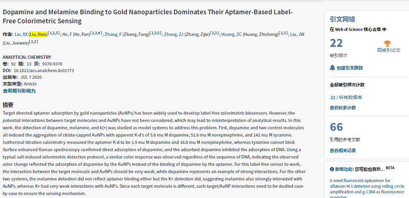 据2020年12月ESI最新数据显示,我重点实验室刘细霞副教授2020年以第一作者在《Analytical Chemistry》上发表题为《Dopamine and Melamine Binding to Gold Nanoparticles Dominates Their Aptamer- Based Label-Free Colorimetric Sensing》的论文入选ESI高被引论文。该论文的第一完成单位为湖北师范大学,论文的通讯作者为滑铁卢大学刘珏文教授。这也标志着我院在国际合作方面取得新成效。该论文获国家留学基金委公派出国留学项目、湖北省青年科技晨光计划等项目资助。