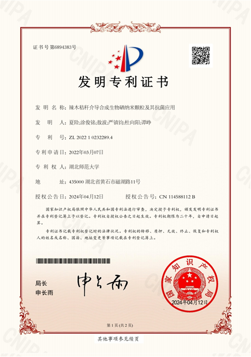 近日,夏险博士团队的“辣木秸秆介导合成生物硒纳米颗粒及其抗菌应用”成果喜获国家发明专利(CN114588112A)。这是团队在涂俊铭教授指导下,继国家发明专利(CN114569558B)和(CN114426990B)后的又一成果。