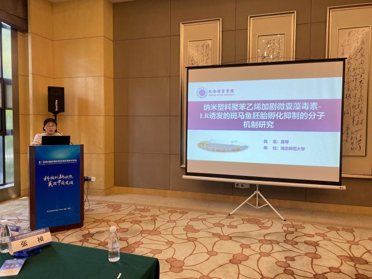 在会议上吴琴老师做学术报告《纳米塑料聚苯乙烯加剧微囊藻毒素-LR诱发的斑马鱼胚胎孵化抑制的分子机制研究》。报告指出纳米塑料聚苯乙烯的存在增加了微囊藻毒素-LR在斑马鱼体内的蓄积,并阐述其加剧斑马鱼的胚胎孵化抑制的分子机制,另外,还提出了益生菌的添加可以有效的缓解微囊藻毒素引发的孵化和生长发育抑制,为环境污染物的风险评估和毒性缓解提供了有效的理论依据。