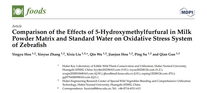 近日,食用野生植物保育与利用湖北省重点实验室刘细霞副教授课题组在5-HMF对斑马鱼氧化应激系统影响的研究中取得新进展,相关成果以“Comparison of the Effects of 5-Hydroxymethylfurfural in Milk Powder Matrix and Standard Water on Oxidative Stress System of Zebrafish”为题,发表在期刊:Foods(JCR分区Q1, IF:5.561)杂志上。第一作者侯莹钰为湖2021级硕士研究生,通讯作者刘细霞。