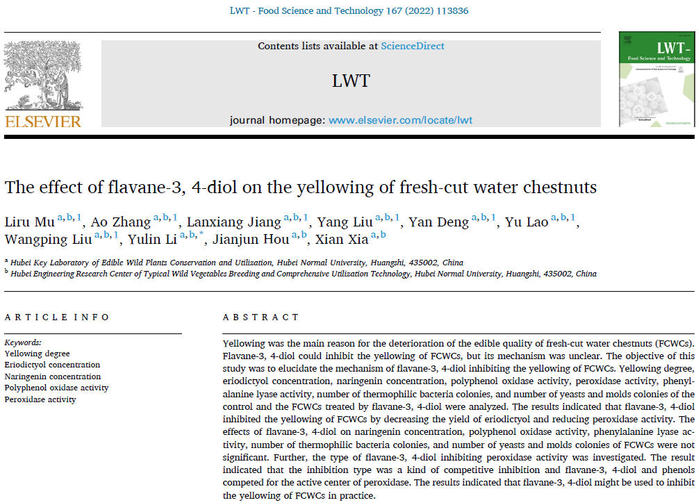 近日,食用野生植物保育与利用湖北省重点实验室的李煜林博士团队在《LWT-Food Science and Technology》(JCR1区,IF:6.056)上发表题为“The effect of flavane-3, 4-diol on the yellowing of fresh-cut water chestnuts”的研究论文。通讯作者为李煜林,其团队的穆丽如、张奥、蒋兰香、刘洋、邓艳、劳玉、刘望平等7名本科生为共同第一作者。
