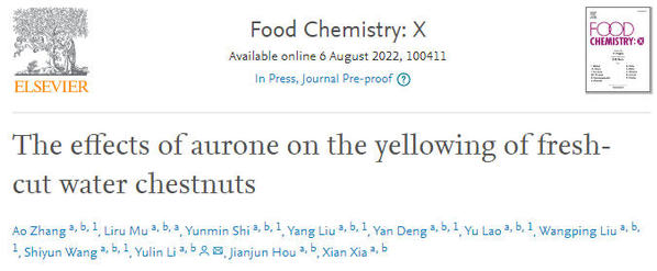 近日,食用野生植物保育与利用湖北省重点实验室的李煜林团队在《Food Chemistrty: X》(JCR1区,IF:6.443)上发表题为“The effects of aurone on the yellowing of fresh-cut water chestnuts”的研究论文。通讯作者为李煜林。其团队的张奥、穆丽茹、施运敏、刘洋、邓艳、劳玉、刘望平、王诗韵等8名本科生为共同第一作者。