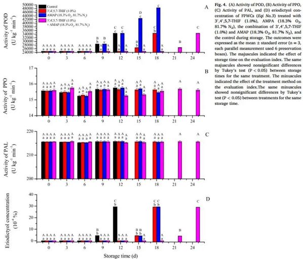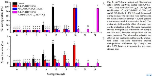 研究结论:3’,4’,5,7-四羟基异黄酮结合活性气调包装通过降低POD活性和圣草酚含量抑制鲜削荸荠的黄化,通过降低质量损失率、抑制呼吸、增加TSS、TA和AA含量保持鲜削荸荠的品质。1.0%的3’,4’,5,7-四羟基异黄酮结合18.3%O2、81.7%N2的气调包装,可以延长鲜削荸荠货架期12天。