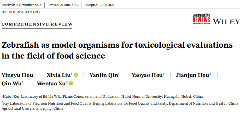 近日,刘细霞副教授研究团队在Comprehensive Reviews in Food Science and Food Safety(JCR Q1,中科院1区TOP期刊,IF 14.8)发表题为“Zebrafish as model organisms for toxicological evaluations in the field of food science”的综述性论文。2021级研究生侯莹钰为第一作者,湖北师范大学为第一通讯单位,刘细霞副教授和中国农业大学许文涛教授为共同通讯作者。