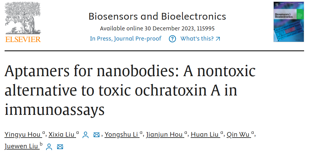 2023年12月,刘细霞副教授团队与滑铁卢大学刘珏文教授合作在生物学Top期刊《BIOSENSORS & BIOELECTRONICS》(中科院1区,IF: 12.6)发表题为“Aptamers for Nanobodies: a Nontoxic Alternative to Toxic Ochratoxin A in Immunoassays”的研究性论文。2021级硕士研究生侯莹钰为第一作者,通讯作者为刘细霞副教授和滑铁卢大学刘珏文教授。