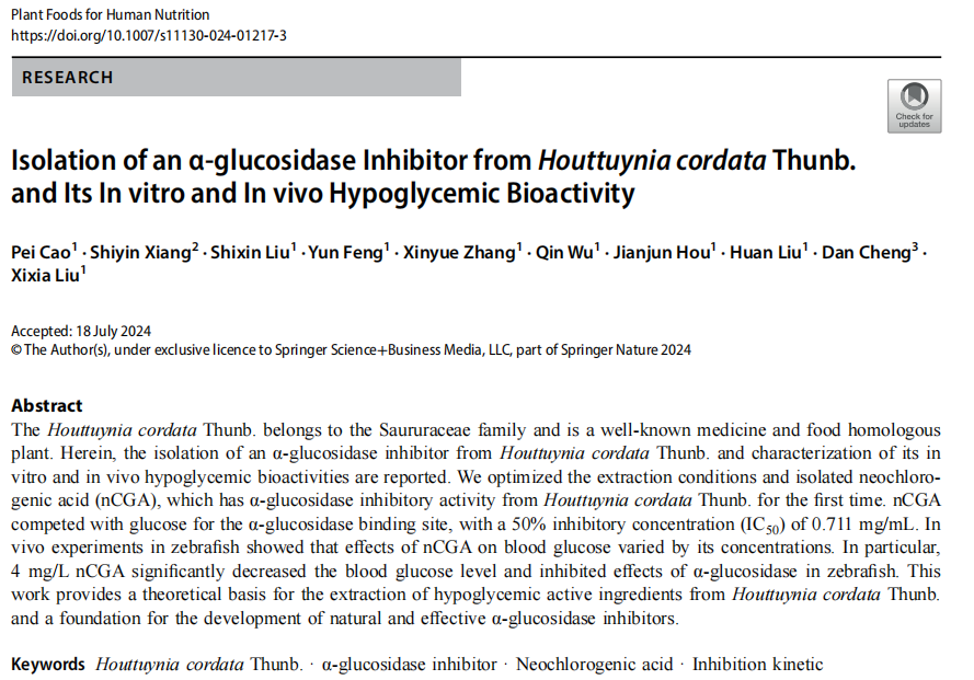 2024年8月,我院刘细霞副教授团队在《Plant Foods for Human Nutrition》(中科院2区)发表题为“Isolation of an α-glucosidase Inhibitor from Houttuynia cordata Thunb. and Its In vitro and In vivo Hypoglycemic Bioactivity”的研究论文。我院2019级本科生曹佩、刘世昕,以及劲牌研究院工程师向诗银为并列第一作者,我院刘细霞副教授为独立通讯作者。