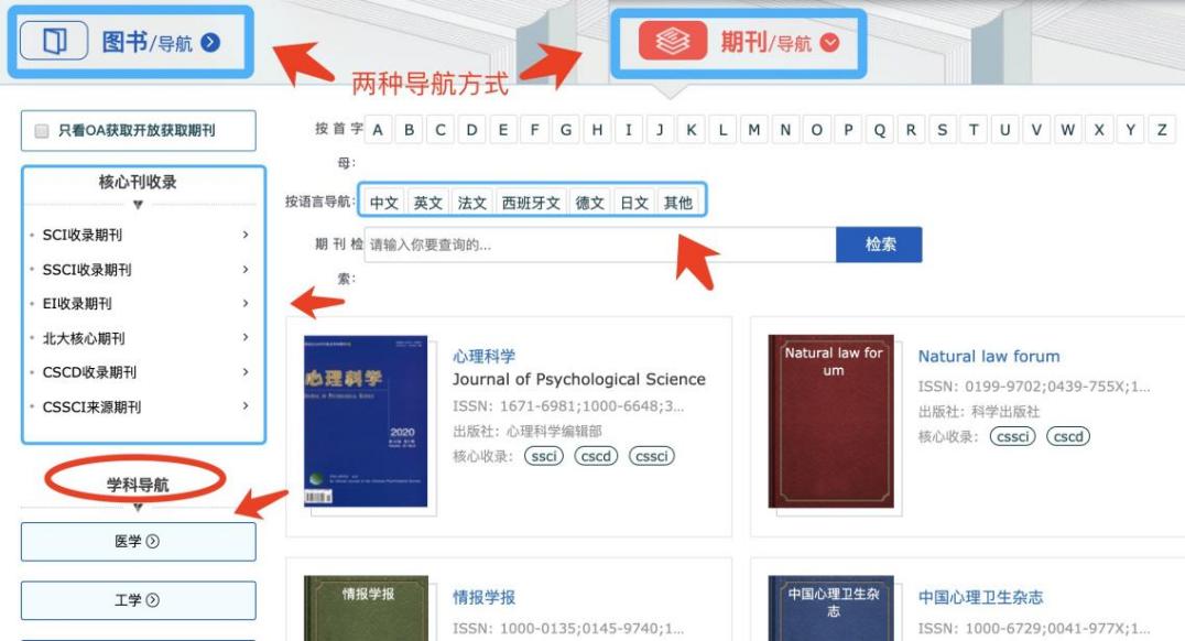 5.部分其他补充:查看学科相关的图书、期刊列表,方便投稿能有更多期刊选择,通过【导航】功能查阅更多学科相关的图书或期刊,期刊包含SCI、北大南大核心、学科、语言等多种筛选方式。导出参考文献题录功能更好应对论文检测。