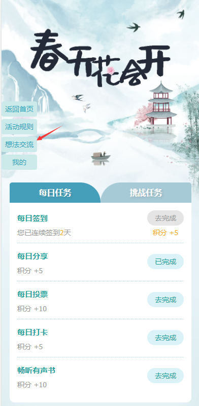 活动任务一:本次活动围绕“四时之景”,以四个季节篇章展开——“春天花会开”、“大暑荷香浓”、“秋色染山河”、“万物藏素裹”,读者通过完成各季节篇章阅读任务获取对应积分。活动结束后将根据积分总排名评选出“阅读之星”颁发荣誉证书及奖品。