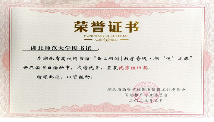 本馆讯 近日,湖北省高等学校图书情报工作委员会公布全省高校图书馆“云上雅游|数字奇遇·探‘悦’之旅”活动获奖结果的通知。在全省高校图书馆线上共读活动中,我校图书馆获“优秀组织奖”,城市与环境学院汪勇获“阅读之星”三等奖,经济管理与法学院郭乐获“阅读达人”三等奖。