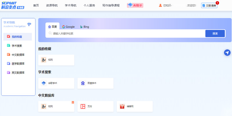 学术导航页为科研工作者提供了全面的学术资源网站导航服务,涵盖学术搜索引擎、中文数据库、医学数据库、英文数据库等。用户通过个人账号登录后,可对常用学术资源网站进行个性化收藏与管理,使用更便捷。