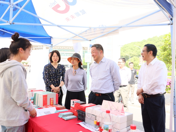 开幕式结束后,校长雷儒金、副校长王赛玉来到图书馆门前樱花路,与同学们共同参加2025年读书节游园会。