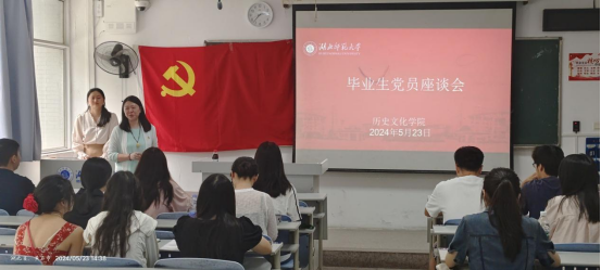 为进一步做好毕业生党员教育工作,引导和激励广大毕业生党员坚定理想信念,以饱满的热情走向新的学习和工作岗位,历史文化学院于2024年5月23日在人文楼21A101教室召开毕业生党员座谈会。历史文化学院党委副书记黎哲、历史文化学院学生第一党支部书记王雅菲以及全体毕业生党员参与此次会议。