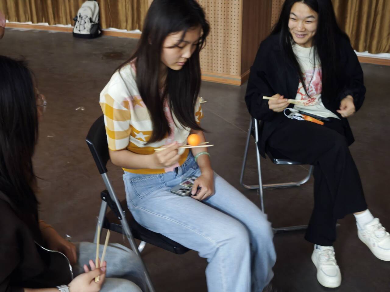 活动开始,破冰游戏迅速点燃现场氛围,同学们在欢声笑语中打破陌生感。随后的“筷子传球”环节,老师们也加入挑战,与同学们默契配合,展现了亦师亦友的亲密互动。“气球保卫战”和“抢凳子”游戏更是将气氛推向高潮,大家在竞技中学会协作,在欢笑中释放压力。“拍卖会”环节别出心裁,同学们通过虚拟竞拍分享自己的价值观和人生目标,而“听歌识曲”则让音乐成为情感的纽带,引发共鸣。活动现场气氛热烈欢快,同学们在轻松有趣的游戏中逐渐卸下压力,整个音乐厅充满了活力与温暖,活动氛围融洽,大家在欢声笑语中真正实现了放松身心、愉悦交流。