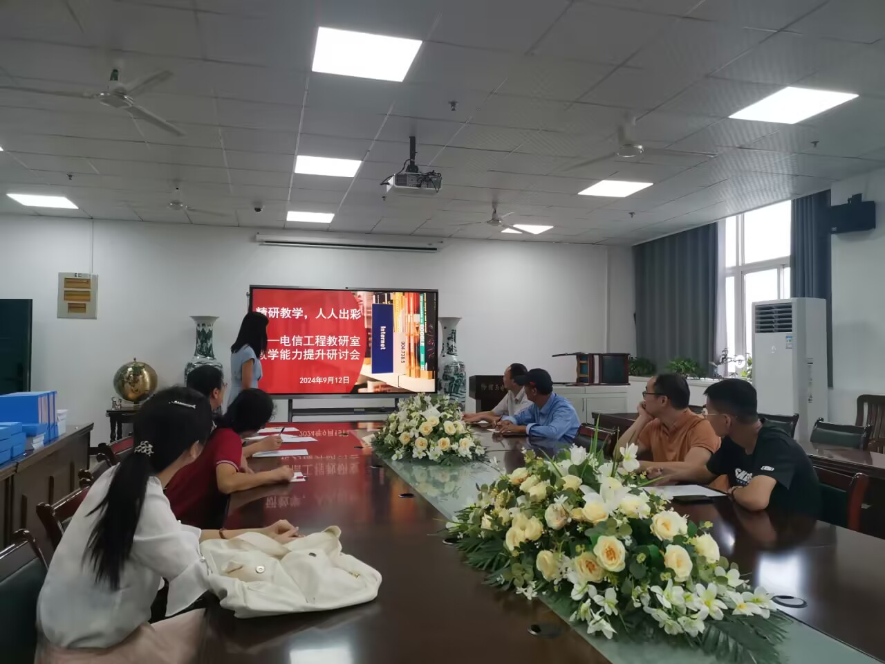 紧接着,9月12日,在信息大楼508会议室,电信工程教研室教学能力提升研讨会正式拉开帷幕。会议伊始,盛彩玉老师以“单片机原理及应用”课程为例,进行了精彩的说课展示。盛老师详细介绍了课程的教学内容、教学目标及教学方法,特别强调了项目教学和重实践的教学理念。她通过具体项目案例,展示了如何引导学生在实践中深化理论理解,提升解决实际问题的能力。这一教学理念得到了与会老师们的广泛认同和赞赏。