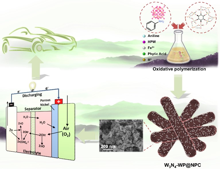 针对上述问题,杜岳博士所在能源与材料催化研究团队在前期工作基础上(Nano Res. 2023, 16, 8893–8901;Nano Res. 2023, 16, 8773-8781; J. Alloy. Compd. 2023, 960: 170789)。通过苯胺-植酸聚合物锚定了多金属氧酸盐分子,经煅烧后直接实现了对多金属氧酸盐分子的原位氮化、磷化,首次构筑了三维多孔W3N4-WP@NPC复合材料。研究结果表明:1)通过分子间配位键形成的Fe3+-植酸配合物,可以提高一定区域内植酸分子的浓度;2)在聚合过程中部分磷钨酸分子靠近Fe3+-植酸配合物,则可被植酸转化为磷化钨组分,而不会被聚苯胺氮化。所制备的W3N4-WP@NPC异质结复合材料具有优异的氧还原活性,具有较大的半波电位和极限电流密度。碳纳米棒上嵌入的W3N4-WP异质结纳米颗粒不仅有利于加速氧还原过程的电荷转移速率,而且可增强组装后的金属空气电池的充放电循环稳定性。上述原位磷化、氮化方法为构筑低成本、高性能的金属空气电池提供了一种简单、高效的新策略。