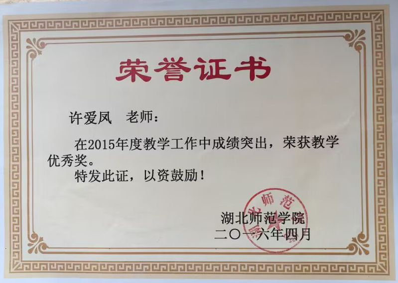 作为一名有着近20年党龄的党员,许老师时刻牢记政治站位,热爱党的教育事业,不仅始终以身作则,教风清廉,与人为善,乐于助人,还担任过黄石市招考命题专家、黄石市和湖北师大理论讲师,多次为黄石市共青团干部、新选拔副处级干部、湖北师大中文、数统、体育等院系师生、黄石市企业领导干部以及黄石市武警消防官兵等,进行马克思主义理论、党的重要理论、习近平重要思想和重要讲话等理论宣讲。积极参与学校各项事务和社区各种志愿活动,任劳任怨。在学校学院领导和同事的帮助下,许老师先后获得了湖北师范大学 “师德优秀”和“师德标兵”荣誉称号。