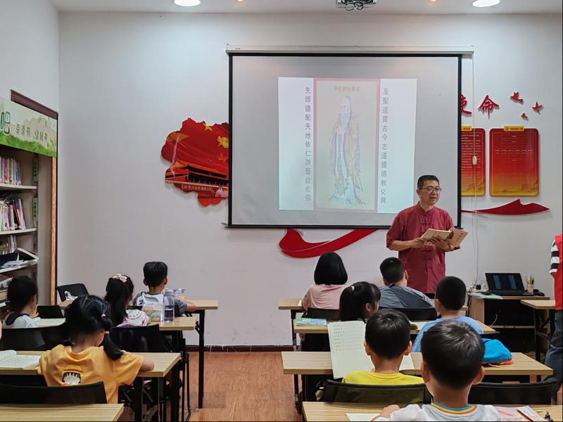 社区国学老师给小朋友们带来了一节国学经典课,实践队的成员们帮助老师分发《论语》读本,并协助老师管理班级纪律,以便于之后国学课程的顺利开展。首先,在国学老师的带领下,实践队的成员们与小朋友们一同四拜孔子。正衣冠,拱手礼,一拜为天地立心,二拜为生民立命,三拜为往圣继绝学,四拜为万世开太平。小朋友们有模有样地学着,从仪式中增强对于儒家思想的认同与尊重。实践队的成员们也在这四拜礼中,也增强了对于儒家文化和教育传统的崇敬。