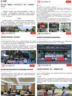 本次“三下乡”暑期社会实践受到实践单位和学生家长的高度评价,受到多家主流媒体宣传报道以及外界广泛关注与支持,体院青年学生在社会大课堂中,厚植爱国情怀,培养奋斗精神。在实地调研中,为乡村振兴注入蓬勃动力。同时,团队在活动期间大力宣传,累计投稿100余次,被中国网、湖北日报(客户端)等各大媒体报道10余次。