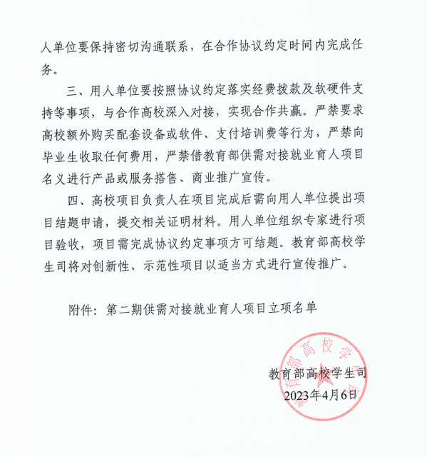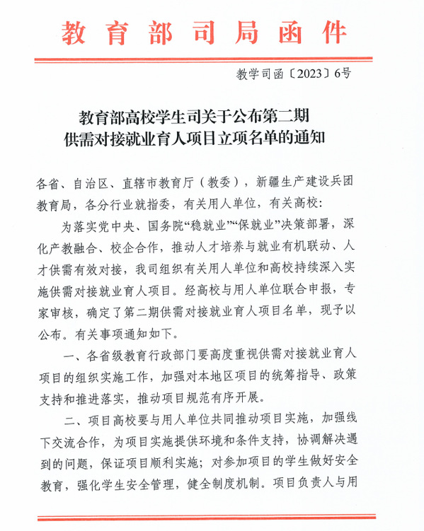 本网讯(通讯员 李娟)日前,教育部高校学生司发布了《教育部高校学生司关于公布第二期供需对接就业育人项目立项名单的通知》(教学司函〔2023〕6号),我校有7项供需对接就业育人项目被批准立项,其中定向人才培养培训项目2项、就业实习基地项目3项、人力资源提升项目2项。