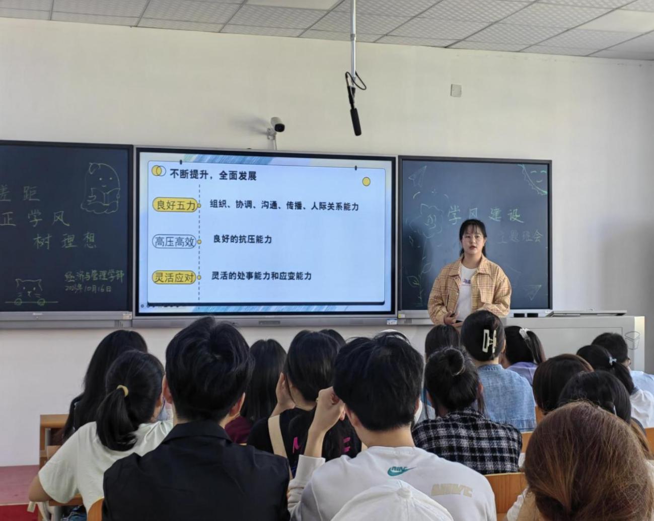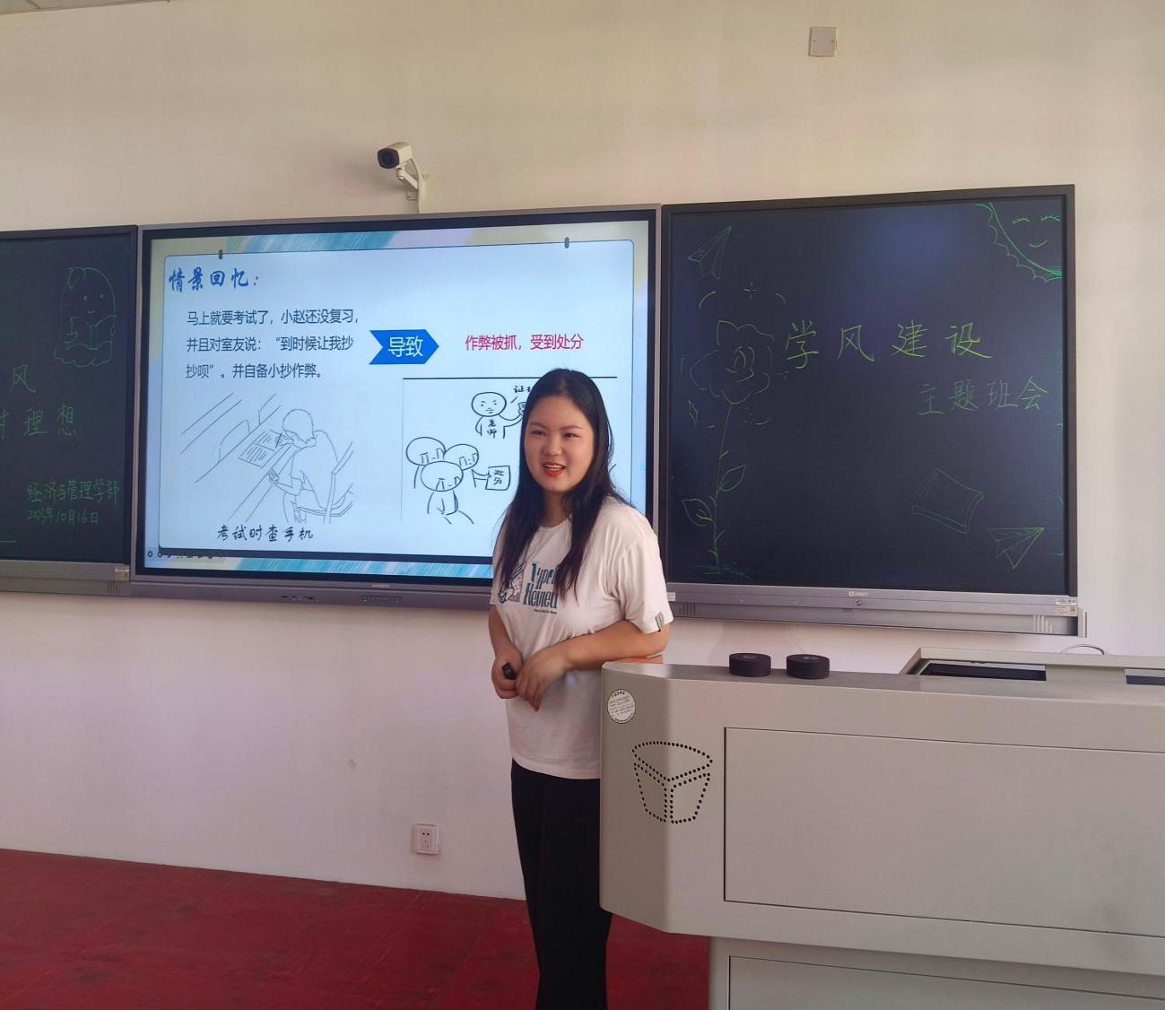 1016日上午10:00,经管学部辅导员吕彩云老师在2-402召开“找差距 正学风 树理想”学风建设主题示范班会,各学部辅导员老师莅临观摩指导。吕彩云老师从不良学风现状、不良学风归因分析、学风建设举措、朋辈分享等方面开展班会,勉励同学们做好大学生涯规划并付诸努力,班会结束之际,吕彩云老师着重提醒同学们提高警惕,防范电信诈骗,强调共青团员不得信仰宗教。同时,提醒大家遵守学校管理规定,不得使用大功率电器,不得饲养宠物。