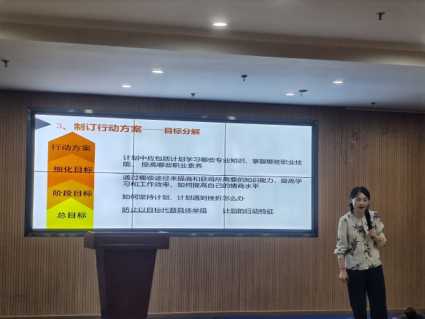 “凡事预则立,不预则废”,边婷婷老师从学生的角度分析,结合多年大学生就业指导案例及工作经验,分别从为什么要做职业生涯规划、职业目标的确立等方面进行讲解,说明了职业生涯规划的重要性,利用真实案例结合自身体会,教会同学们客观分析自己的核心潜能,正确认识自己的长处和优势,结合个人实际情况确定适合自己的职业方向,并努力提升自己的专业技能和职业本领,通过自身的奋斗和拼搏去实现自己的梦想。