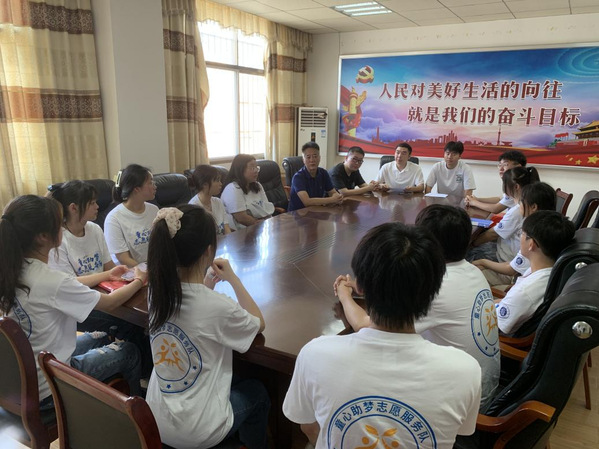7月6日,出发前,团委书记陈荟芸叮嘱志愿者:将青春汗水挥洒在祖国的大地上,让激昂的青春在新征程中闪光,将爱国热情和成长成才的强烈愿望转化为实际行动,将一颗热忱的心奉献给支教志愿服务活动。12名志愿者怀着真诚和热爱,在指导老师唐浩然的带领下来到了黄石市阳新县木港镇木港小学,受到了我校人文学部党总支书记、子山村驻村工作队队长赵卫军,木港镇团委书记曹宇轩,木港镇团委副书记万亮,木港小学校长吴平仁的热情接待。