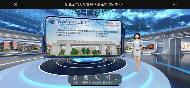 湖北师范大学文理学院元宇宙招生大厅是基于元宇宙技术(虚拟现实、数字孪生、三维建模、人工智能等)打造的数字化3D招生大厅,考生和家长可以在大厅内身临其境全方位了解学校,同时大厅内3D数字老师为大家介绍学校